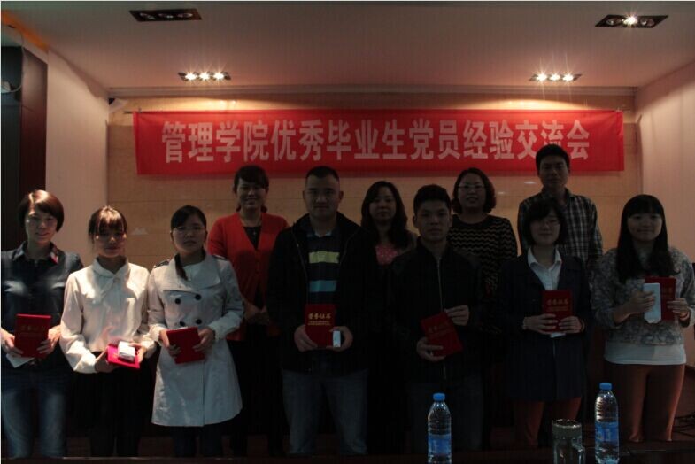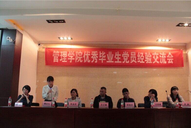 2014年5月29日晚7点,管理学院优秀毕业生党员交流会于管院三楼报告厅举行。管理学院党委副书记于松,团委书记芮丽华,学生科科长王珂,学生科丁元老师出席了本次交流会。薛怡、谭志红、吴金定、王江锋、欧祖佳、倪菁菁、李娴等七位大四同学作为优秀党员代表参加了此次交流会。