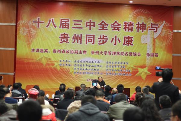 2013年12月15日下午,由共青团贵州省委、乐鱼(中国)主办,贵州省青年企业家协会、贵州省青年商会、贵州省女企业家协会、贵州省妇女手工协会、贵州大学EMBA教育中心、贵州大学EMBA校友会承办的“党的十八届三中全会精神与贵州同步小康”专题讲座在贵州省政协议政厅举行。省政协副主席、乐鱼(中国)名誉院长孙国强教授受邀作专题讲座。讲座由共青团贵州省委马宁宇书记主持,省妇联罗宁主席出席了讲座。来自省青年企业家协会、省青年商会、省青年创业就业基金会、乐鱼(中国)EMBA&MBA校友共300余名青年企业家聆听讲座。