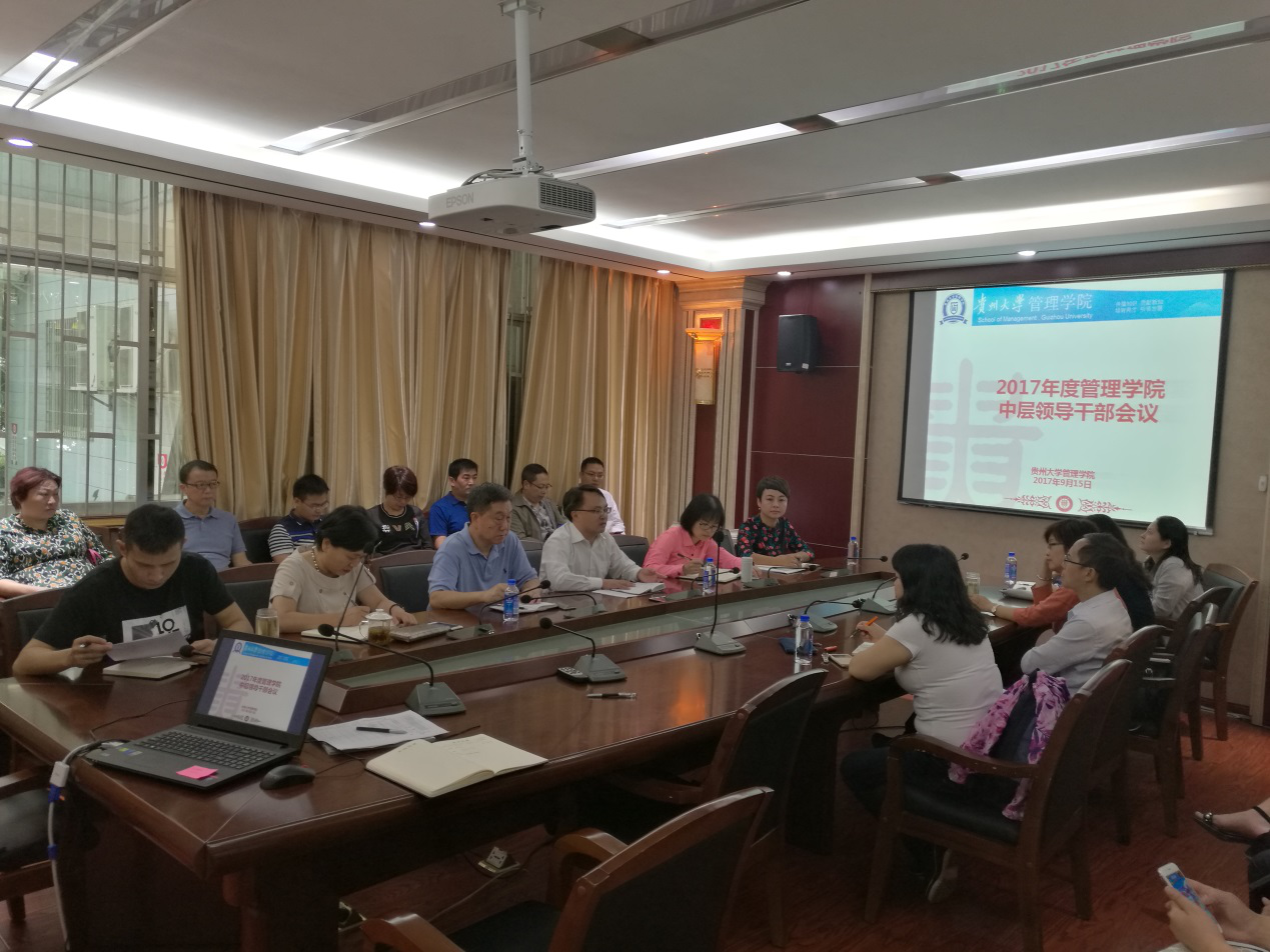 9月15日10:00,管理学院召开2017年秋季学期中层干部会议,学院党政领导班子、各科室(中心)负责人、系主任、系党支部书记等中层干部出席会议,会议由党委书记陶玉顺主持。