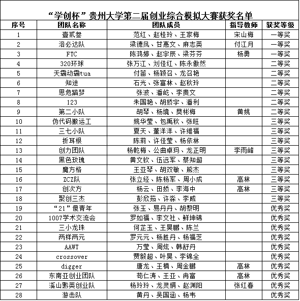 本次比赛覆盖范围较为广泛,参赛团队来自于管理学院、大数据与信息工程学院、矿业学院、公共管理学院、外国语学院、法学院、阳明学院等。比赛方式为计算机上模拟竞赛,比赛成绩由软件直接给出,比赛结果客观、公平。报名的28个小组在经历了3小时的奋战之后,各个团队成绩即刻由软件统计出来,最终评出一等奖3个,二等奖6个,三等奖9个,优秀奖10个。