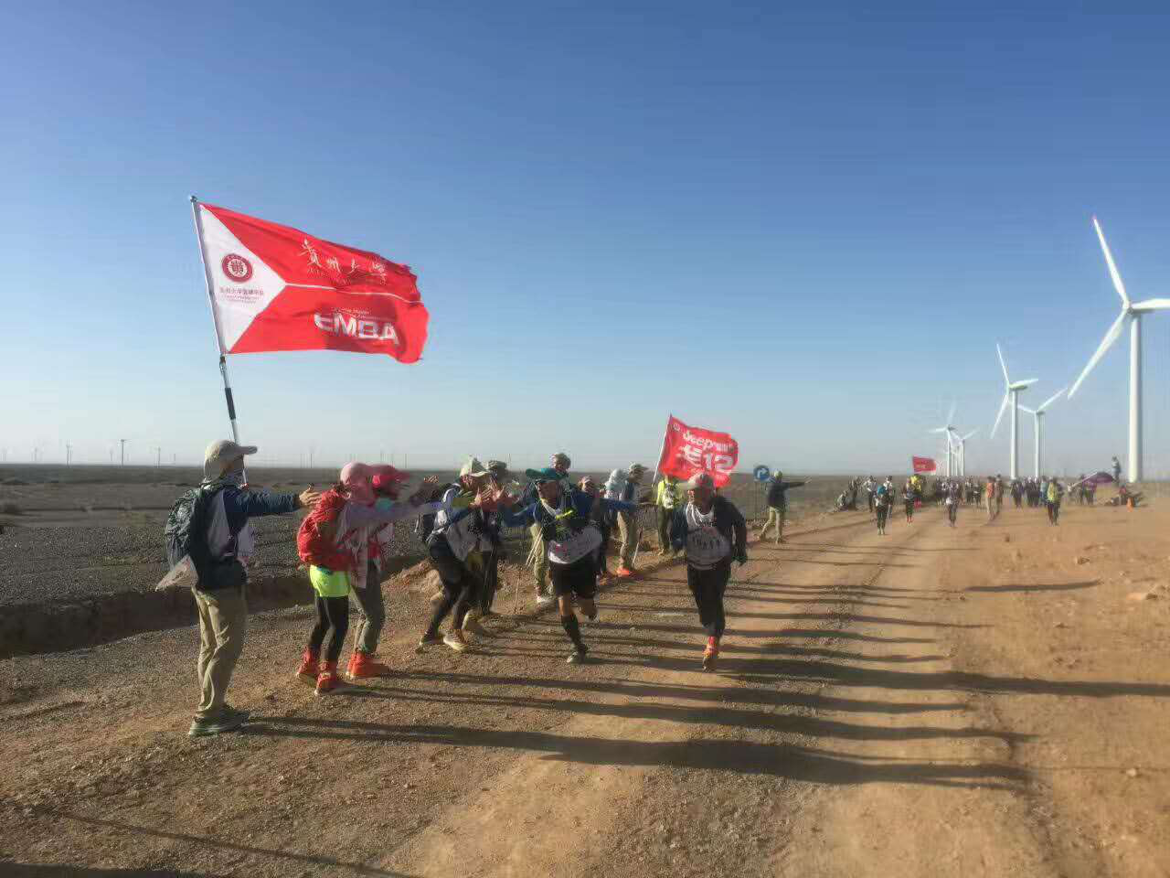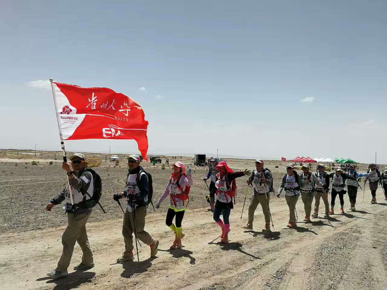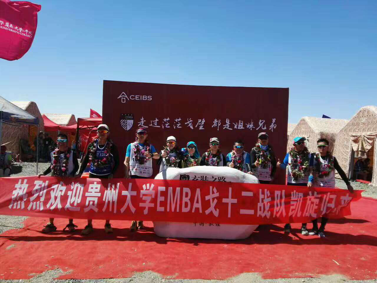 5月22日“第十二届玄奘之路商学院戈壁挑战赛”正式拉开战幕。每年的戈赛都是戈友们向全国乃至国外高校展示贵州大学风采的最佳时刻。在整个赛程中,贵大戈友们始终秉承贵州大学的精神—“理想、行动、坚持”不放弃、坚持再坚持,哪怕身体已经到了生理上的极限,也依然勇敢向前。队友们的相互激励和鼓励,使戈友们坚信:“一起出发、一起到达。”在本次赛事中,贵州大学EMBA戈十二战队的企业家们在戈壁上释放自己,回归自我最真实的一面。他们高举着旗帜、呐喊着口号,在玄奘之路上留下永恒的记忆。