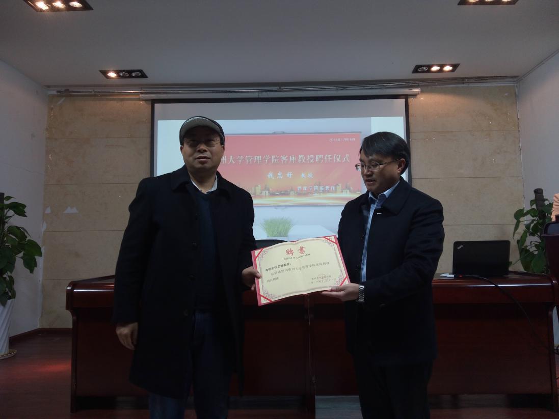 2016年12月16日上午10:00,由哲学社会科学研究院主办、管理学院承办的贵州大学人文社会科学学术讲座第74期文科讲坛在管理学院302报告厅开讲。中国生态学会资源与环境专业委员会委员、南京农业大学博士生导师、扬州大学教授钱忠好受邀担任主讲嘉宾。报告会由管理学院副院长宋山梅教授主持,讲座前聘请钱忠好教授成为乐鱼(中国)客座教授,由管理学院院长李烨颁发了聘书。