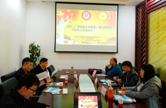 2016年12月4日上午,贵州大学喀斯特地区发展战略研究中心与《广西民族大学学报》举行合作交流会。会议在管理学院三楼会议室举行,中心主任、管理学院院长李烨教授、《广西民族大学学报》编辑部主任、博士生导师秦红增教授、中心常务副主任李晓红教授、副主任李桥兴教授、中心项凯标博士等出席交流会。双方就创新合作机制,共同推出高质量研究成果达成初步共识。