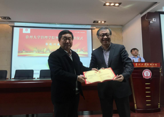 报告伊始,李烨院长代表贵州大学研究生院正式宣布聘请郭晓川教授成为贵州大学校外博士生导师、管理学院客座教授,由管理学院党委陶玉顺书记颁发了聘书。