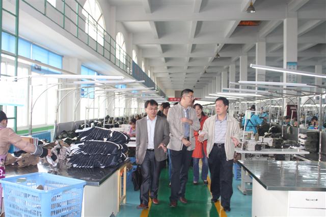 在际华3537公司副总经理杨俊和副书记李永宝的陪同下,学院专家教授一行参观了公司的鞋子制作车间、流水线。