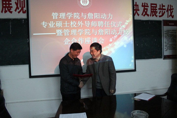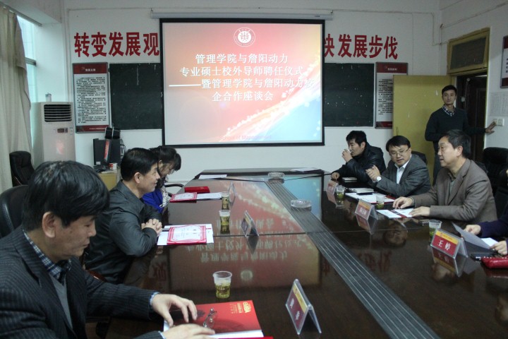 2013年11月20日下午,在乐鱼手机网页版登录入口三楼会议室成功举行了“管理学院与詹阳动力专业硕士校外导师聘任仪式暨管理学院与詹阳动力校企合作座谈会”。