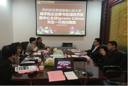2017年10月26日,英国诺森比亚大学商学院企业家与区域经济发展中心主任Ignazio Cabras博士和英中贸易研究院亚太区首席代表朱磊一行二人来访乐鱼手机网页版登录入口,出席本次座谈的还有乐鱼(中国)院长李烨教授、副院长王婷教授、副院长周莉莉教授、副院长宋山梅教授和MBA教育中心副主任何跃勇。