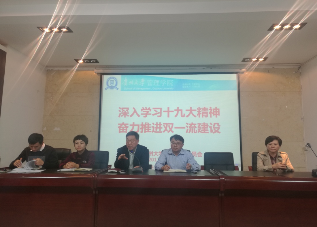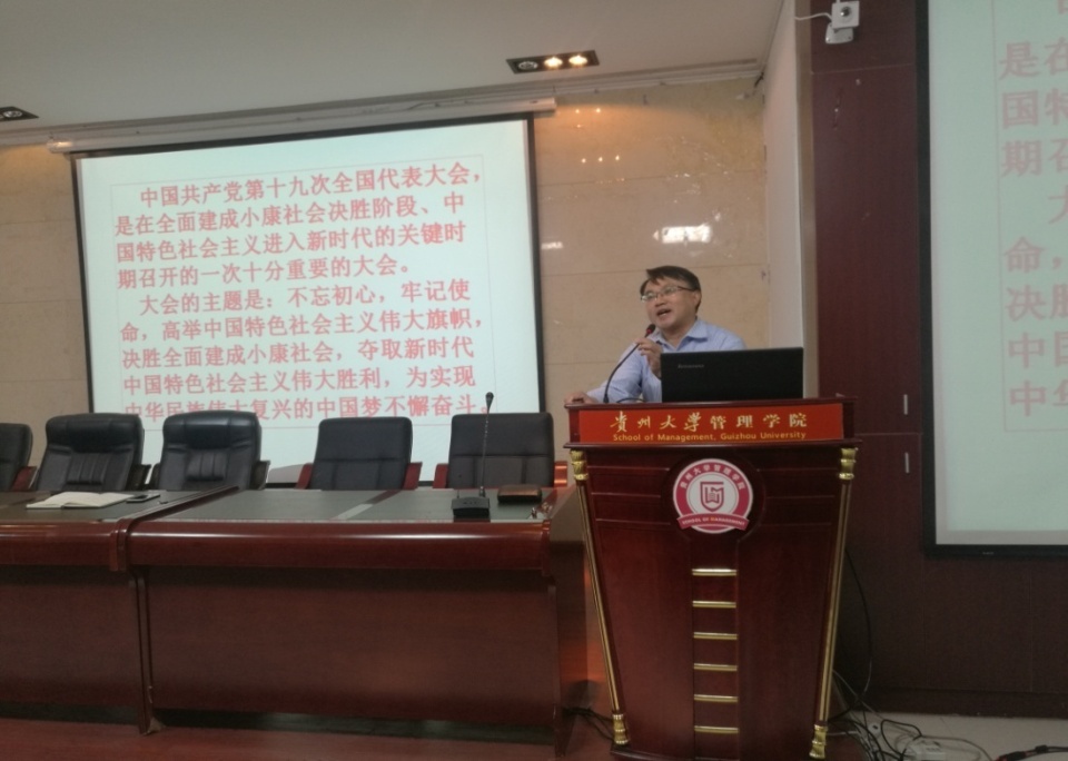 李烨院长以“深入学习领会十九大精神奋力开启管院发展新征程”为主题,向大会通报了学习党的十九大精神心得。李院长表示十九大的胜利召开开辟了中国特色社会主义发展新时代,提出人民对美好生活的需要与不平衡不充分发展之间的矛盾的新论断,确立了“习近平新时代中国特色社会主义思想”的理论指导地位,部署了分两步走、到2050年建成社会主义现代化强国的新目标,并从十四个(坚持)方面谋划今后我们要干什么、怎么干、怎么干得更好。习近平总书记在参加党的十九大贵州省代表团讨论时对贵州的重要指示:“希望贵州的同志全面贯彻落实党的十九大精神,大力培育和弘扬团结奋进、拼搏创新、苦干实干、后发赶超的精神,守好发展和生态两条底线,创新发展思路,发挥后发优势,决战脱贫攻坚,决胜同步小康,续写新时代贵州发展新篇章,开创百姓富、生态美的多彩贵州新未来。”