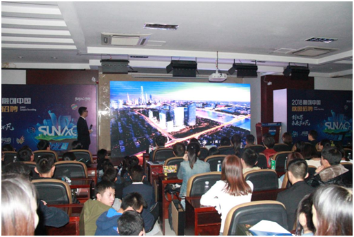 宣讲会第一项是走进融创,在通过观看一则短片大致向我们展示了融创中国后,由刘锐总经理进行详细介绍。他首先提到了融创中国的口号“与时代同行,为未来筑梦”,接着介绍了融创中国的的发展过程、销售金额以及代表作品等,最后刘锐经理重点介绍了西南区域公司。