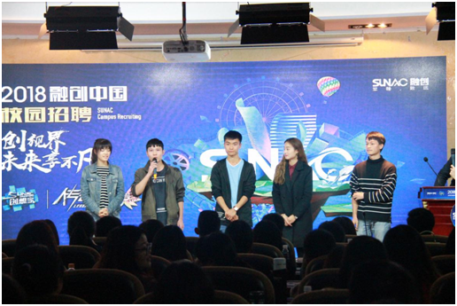 宣讲会第四项是由主持人张敬儒和刘锐经理共同与同学们互动进行面试直通车,来自不同高校的13位同学在面对“你为什么选择融创”、“融创为什么选择你”以及“个人素质与融创六个使命相符合的地方”这三个问题进行了精彩的一分钟演讲。最终十位同学成功的获得了直接二轮面试的机会。