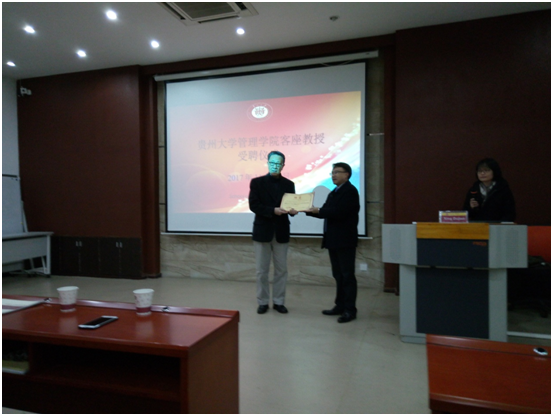 2017年11月20日14:30,由哲学社会科学研究院主办、管理学院承办的贵州大学人文社会科学学术讲座第61期文科讲坛在管理学院302报告厅开讲。美国哥伦比亚大学博士、美国蒙特克莱尔州立大学工商管理学院信息系统管理及商业分析学终身教授、美国纽约华尔街信息战略发展论坛专题演讲人邢陆宾受邀担任主讲嘉宾。报告会由管理学院副院长王婷教授主持,讲座前聘请邢陆宾教授成为乐鱼(中国)客座教授,由管理学院院长李烨教授颁发了聘书。