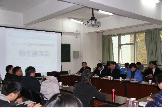 为提高教学质量,更好地完成学校教务处关于2017-2018学年第一学期期中教学检查要求,听取学生意见、加深师生关系,乐鱼手机网页版登录入口于11月23日中午1:00,在学院408教室召开期中教学检查师生座谈会。院长李烨、副院长宋山梅、院党委副书记张亚军出席会议,学院督导组老师,各教研室主任,教学科、学生科老师,及14-16级各班学生代表共40余人参加座谈会。会议由分管教学副院长宋山梅主持。
