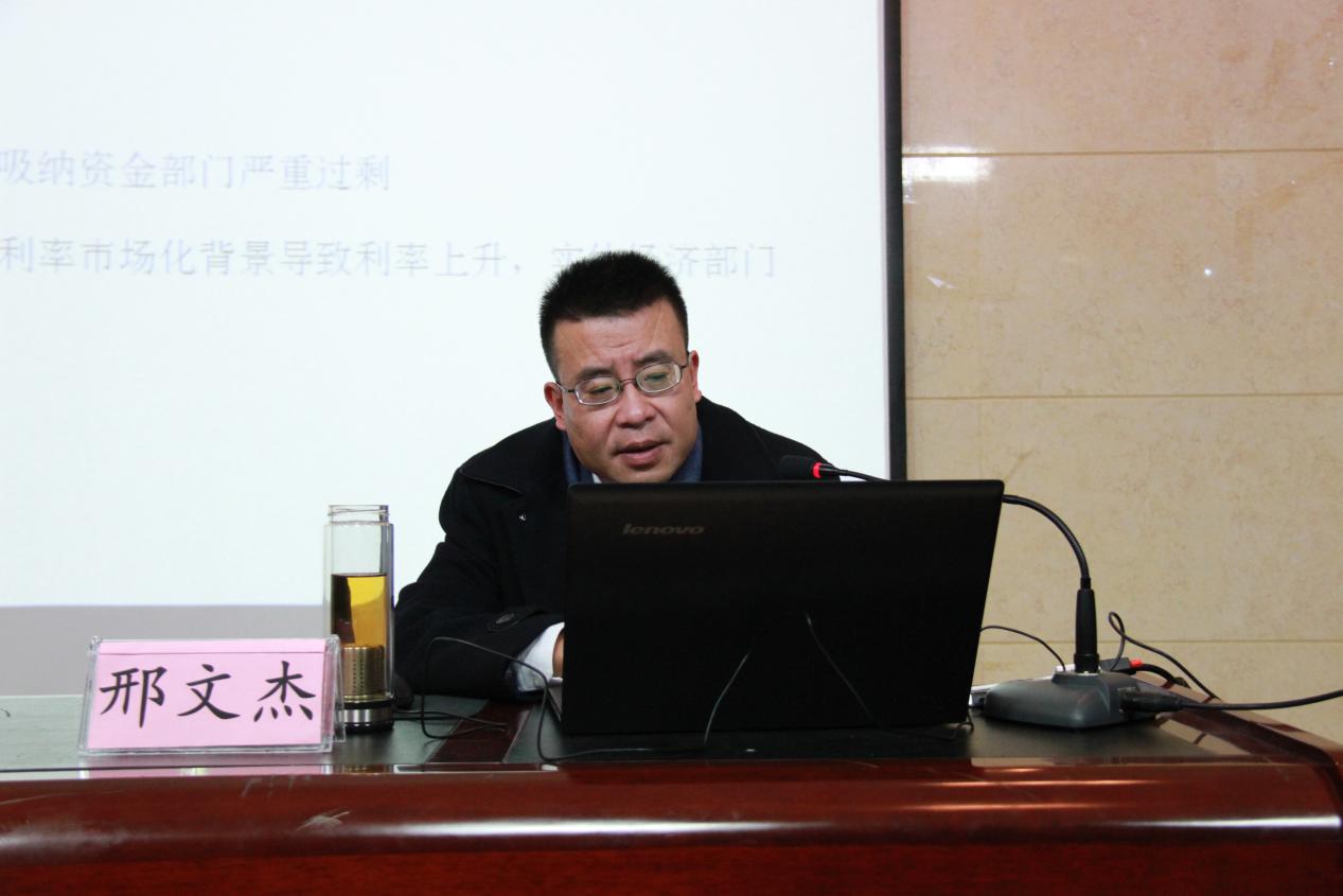 为进一步在乐鱼手机网页版登录入口掀起广大师生党员学习宣传贯彻党的十九大精神的热潮,2017年12月8日上午10:00,邢文杰博士受邀为全院师生党员开展深入学习宣传贯彻党的十九大精神系列讲座—《中国宏观经济形势分析》。学院领导、各系教师党员和学生党员聆听了讲座,讲座由院学生科科长芮丽华老师主持。