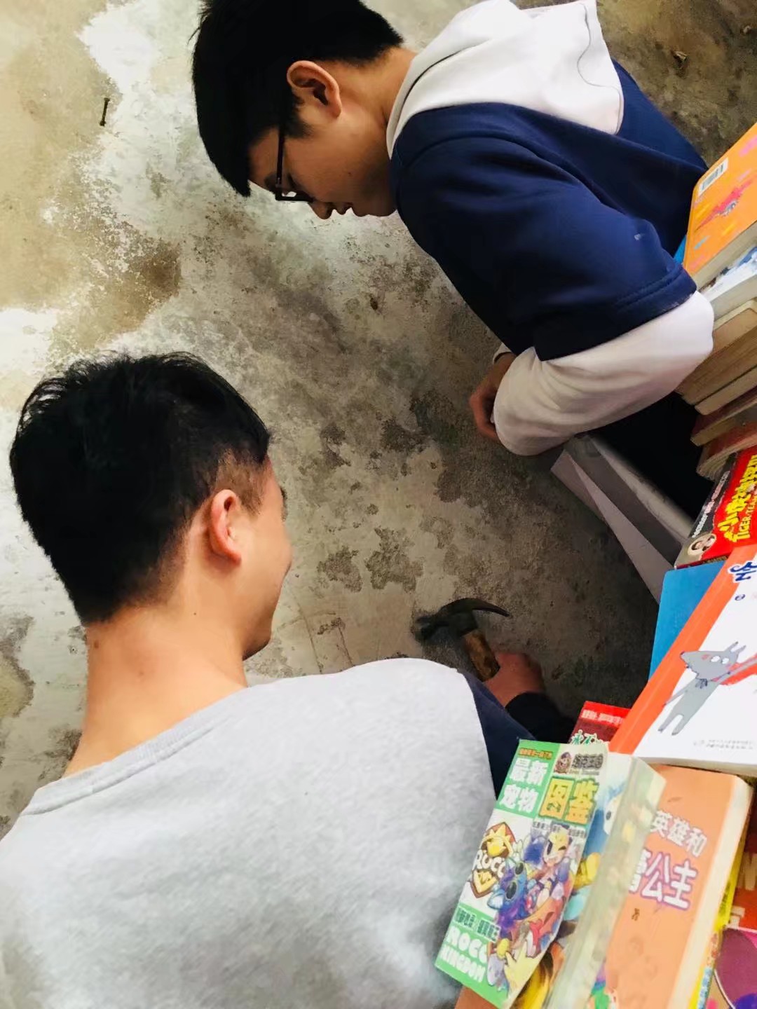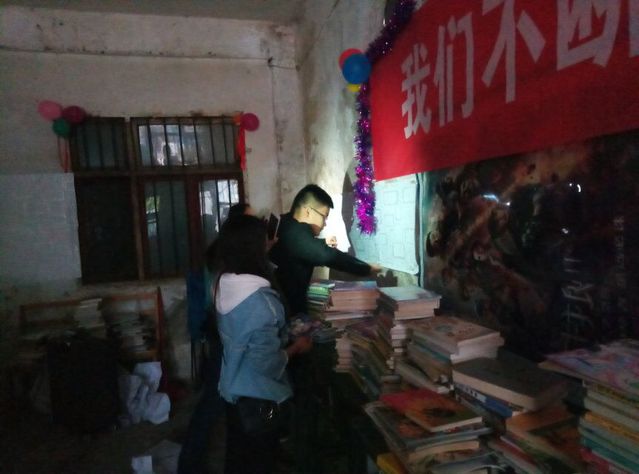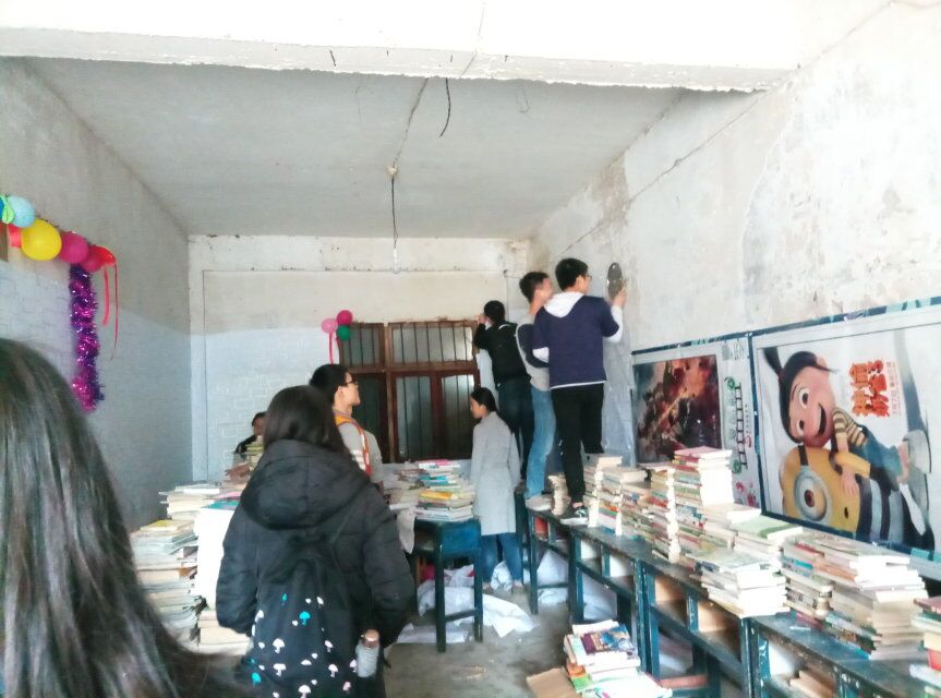志愿者们先对书屋图书进行整理以及书屋环境进行清扫,维护书屋良好的环境。因为书屋常年潮湿,墙皮大多已经脱落,为了防止图书受潮发霉,志愿者们花了将近5个小时的时间,清扫墙面,同心协力贴上了防潮壁纸。