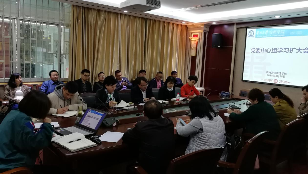 2018年3月28日下午14:30,管理学院在致远楼一楼案例室1召开党委中心组学习扩大会议。学院领导、党政办公室成员、学院各党支部书记及相关委员参加会议,会议由学院院长李烨教授主持。