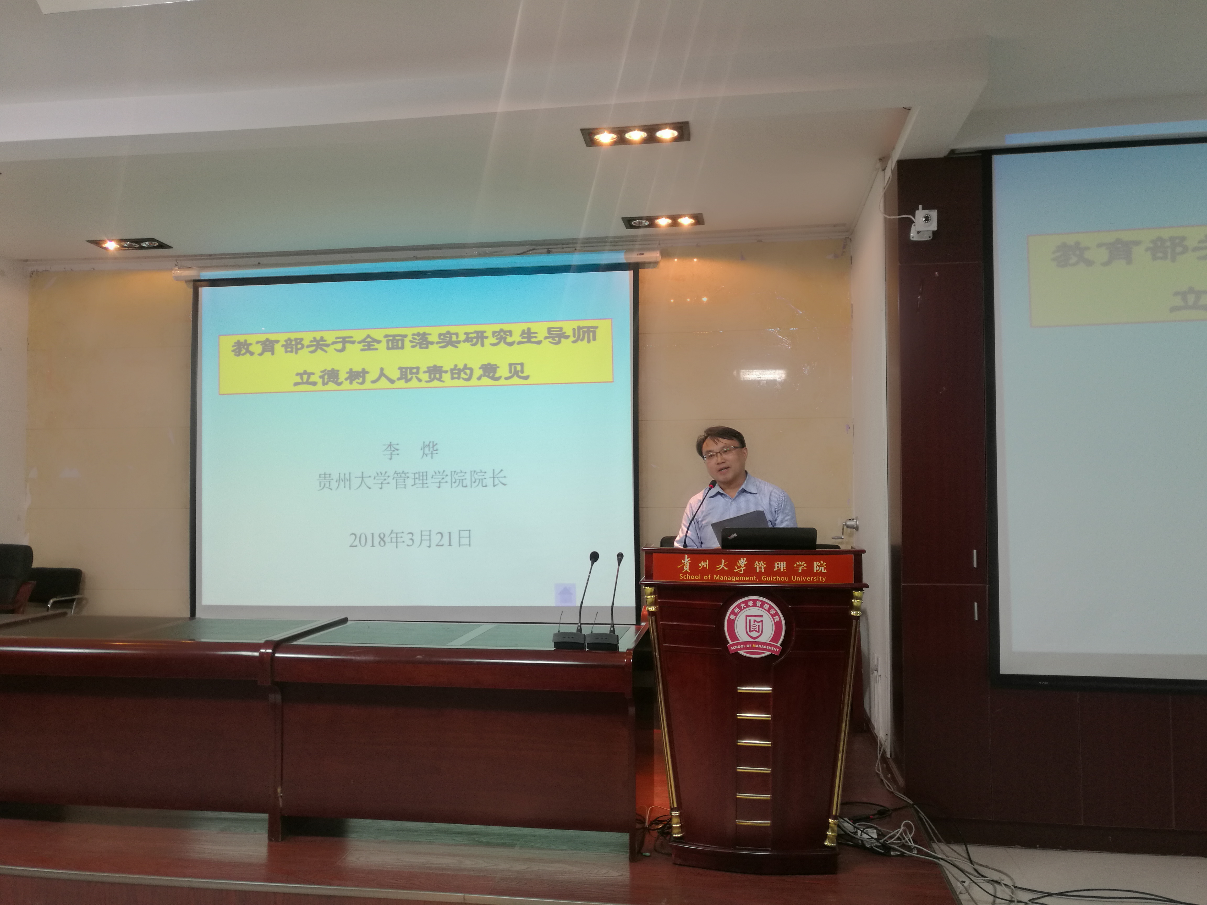 最后,李烨院长向与会导师解读了《教育部关于全面落实研究生导师立德树人职责的意见》。李院长主要从指导思想和总体要求、强化研究生导师基本素质要求、明确研究生导师立德树人职责、健全研究生导师评价激励机制、强化组织保障等五个方面对文件进行了解读。