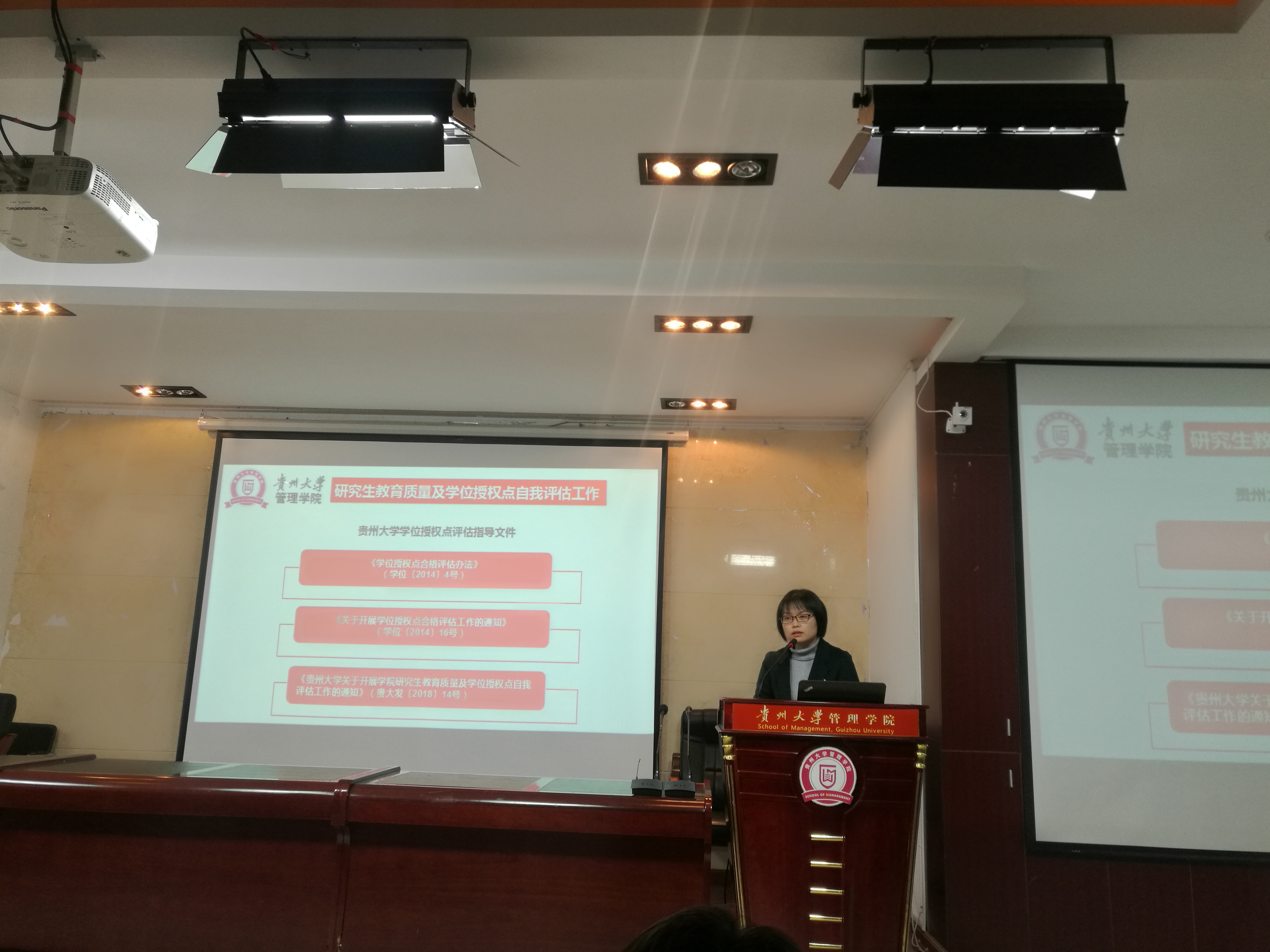 副院长王婷教授主要向大会做学院学位授权点自我评估工作的报告,主要围绕评估指导文件、指导思想、工作日程安排、工作流程、以及评价指标体系等方面进行汇报。此次学位授权点自我评估涉及一级指标5个、二级指标23个,评估期间需要各位导师的支持与配合。