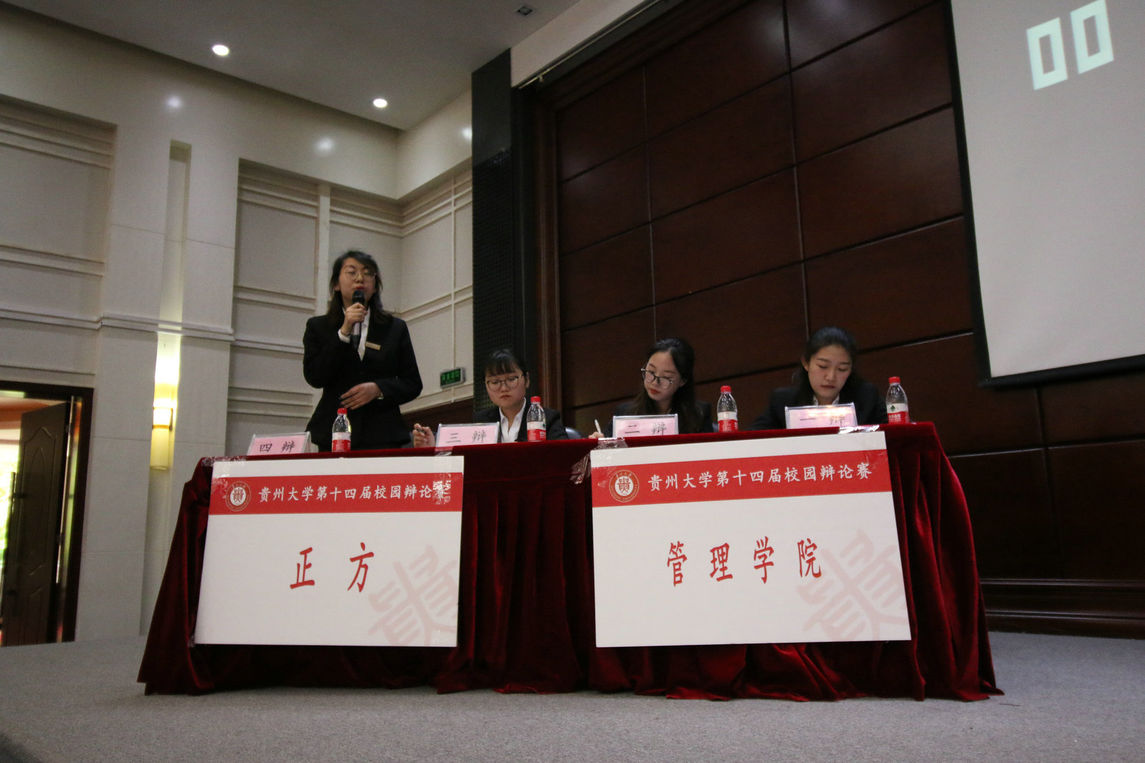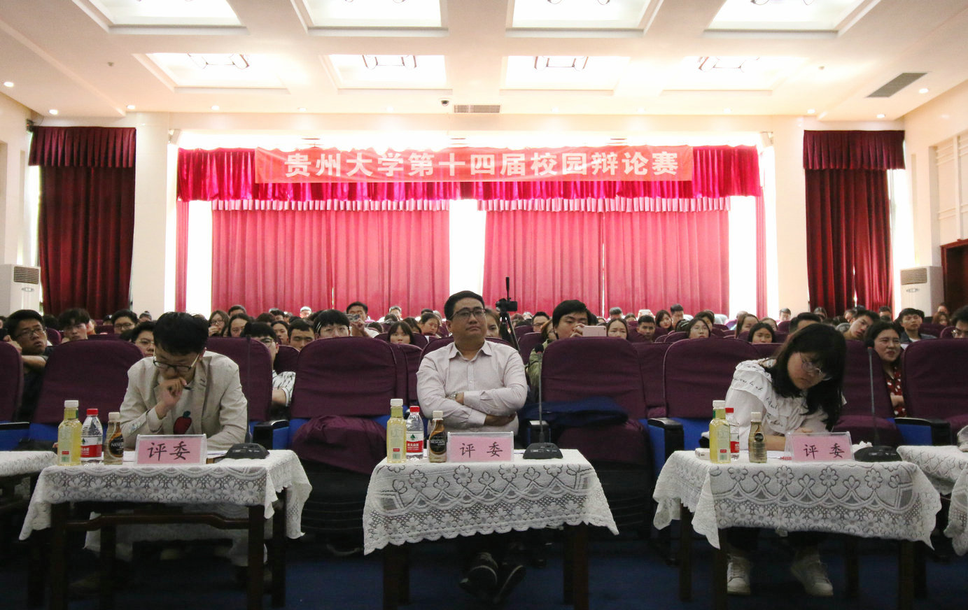 2018年4月21日下午14:00,贵州大学第十四届校园辩论赛初赛第三场在北校区一号行政楼报告厅举行。此次比赛特邀贵州大学党委办公室、校长办公室副主任张林老师以及贵州大学优秀辩手杜雪健同学、杨樑棹同学担任评委。