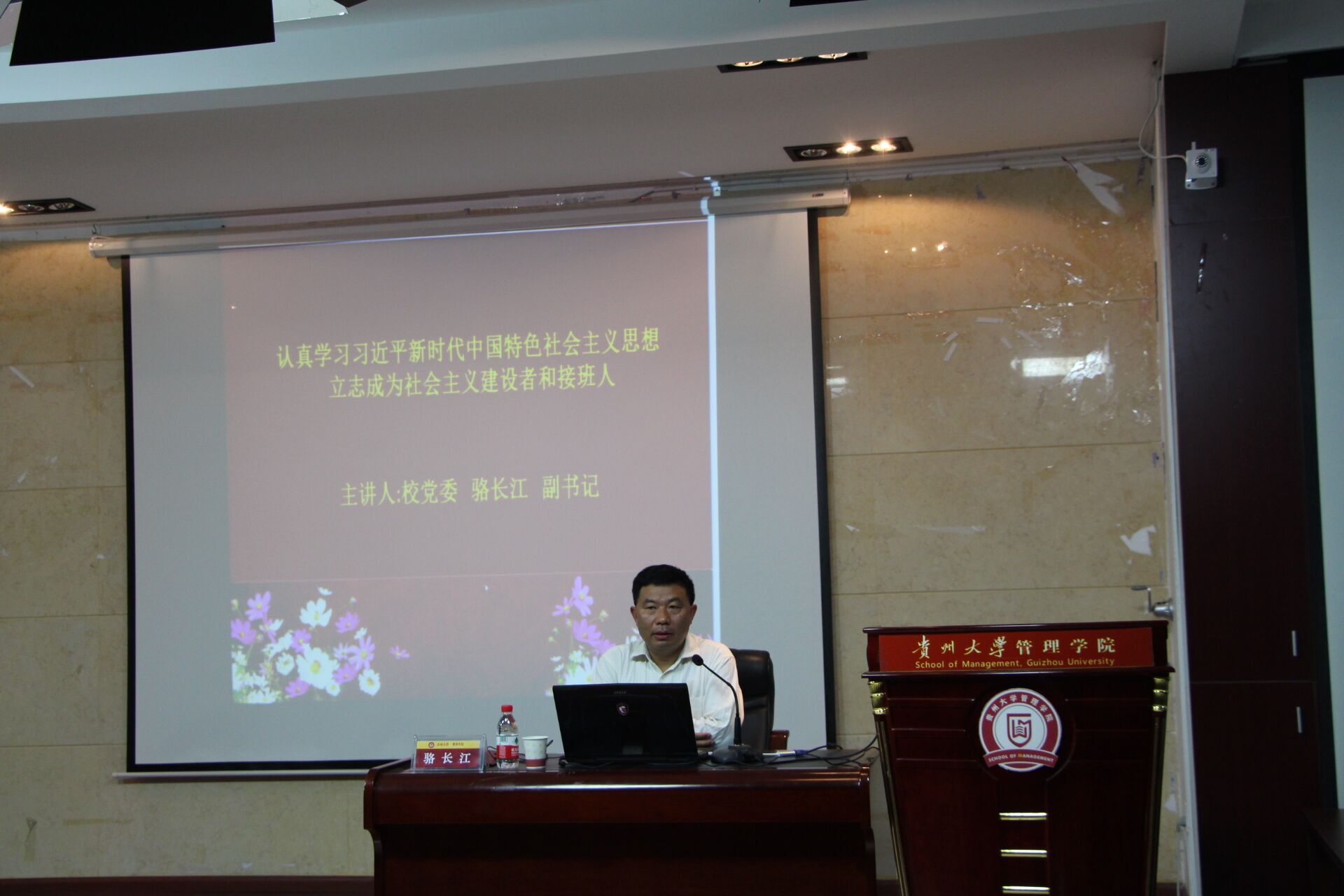 为认真贯彻落实教育部、贵州省教育厅和学校关于认真做好“学习新思想千万师生同上一堂课活动”,教育引导广大师生深刻领会习近平总书记在北京大学师生座谈会和纪念马克思诞辰200周年大会上的讲话精神的丰富内涵和精神实质,明确新时代教育工作的使命担当和广大师生的责任要求,6141900,校党委骆长江副书记受邀在管理学院三楼报告厅为学院研究生党员、发展对象和入党积极分子开展题为“认真学习习近平新时代中国特色社会主义思想,立志成为社会主义建设者和接班人”的专题讲座,共150余名同学聆听了讲座。