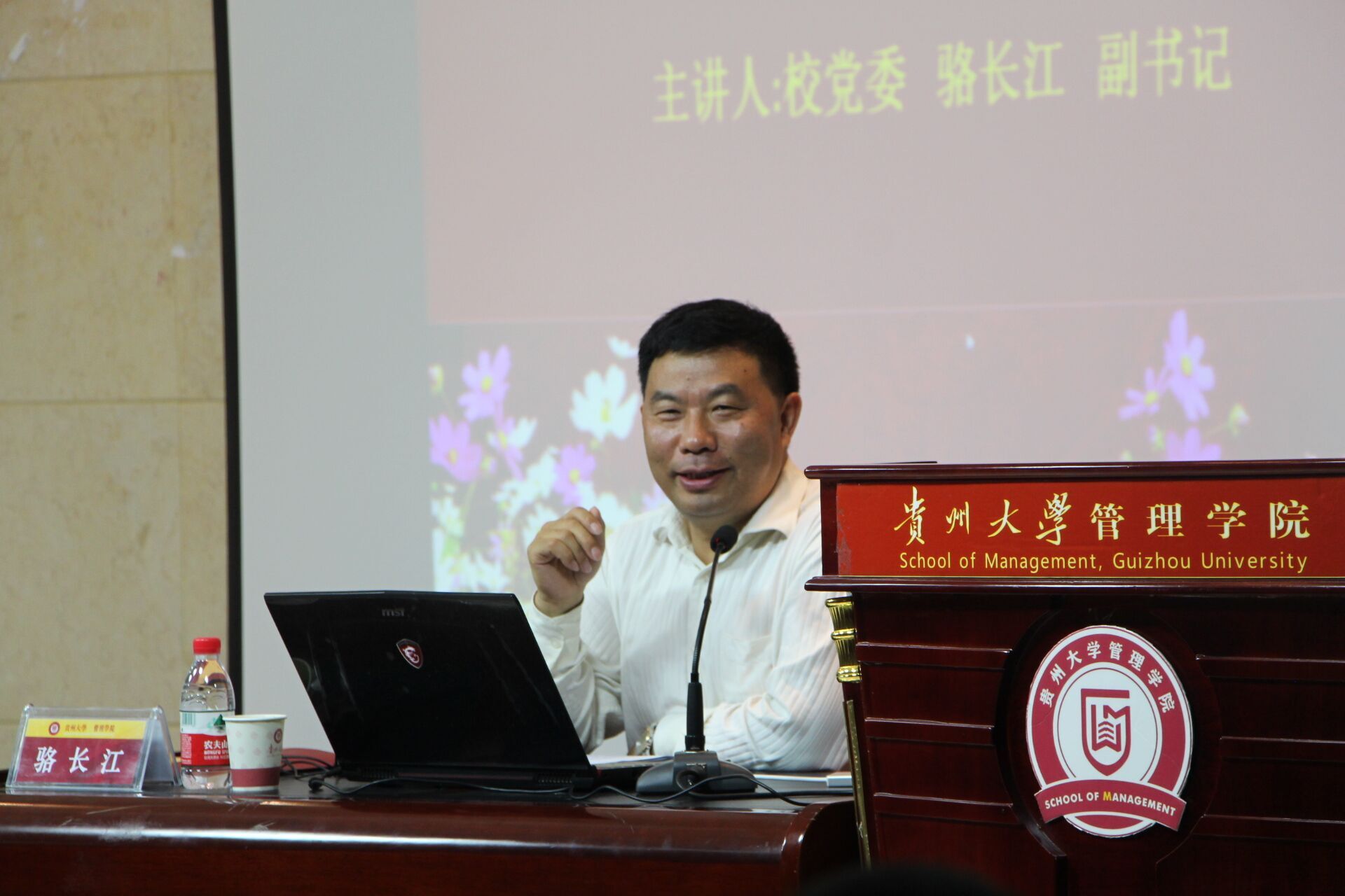 为认真贯彻落实教育部、贵州省教育厅和学校关于认真做好“学习新思想千万师生同上一堂课活动”,教育引导广大师生深刻领会习近平总书记在北京大学师生座谈会和纪念马克思诞辰200周年大会上的讲话精神的丰富内涵和精神实质,明确新时代教育工作的使命担当和广大师生的责任要求,6月14日晚19:00,校党委骆长江副书记受邀在管理学院三楼报告厅为学院研究生党员、发展对象和入党积极分子开展题为“认真学习习近平新时代中国特色社会主义思想,立志成为社会主义建设者和接班人”的专题讲座,共150余名同学聆听了讲座。