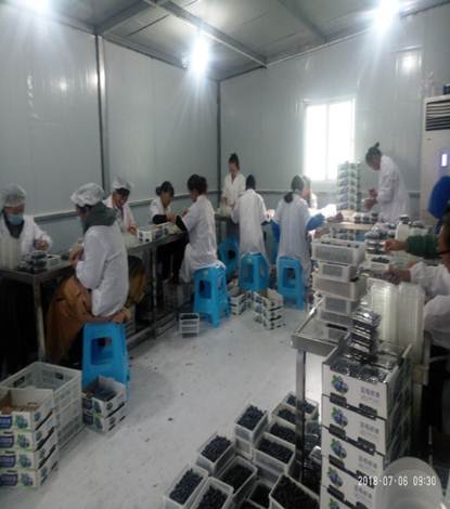 四名同学来到伊胜有限公司后结识了公司负责人冯总,同学们在与冯总交流的过程中了解到该公司蓝莓基地建成时间是1998年,是当地最早种植蓝莓的地方,而冷库建成时间是2010年12月,同时,冯总跟同学分享了公司的运作模式和运营情况,然后,冯总带领同学们参观了自己的冷库和分拣包装中心。
