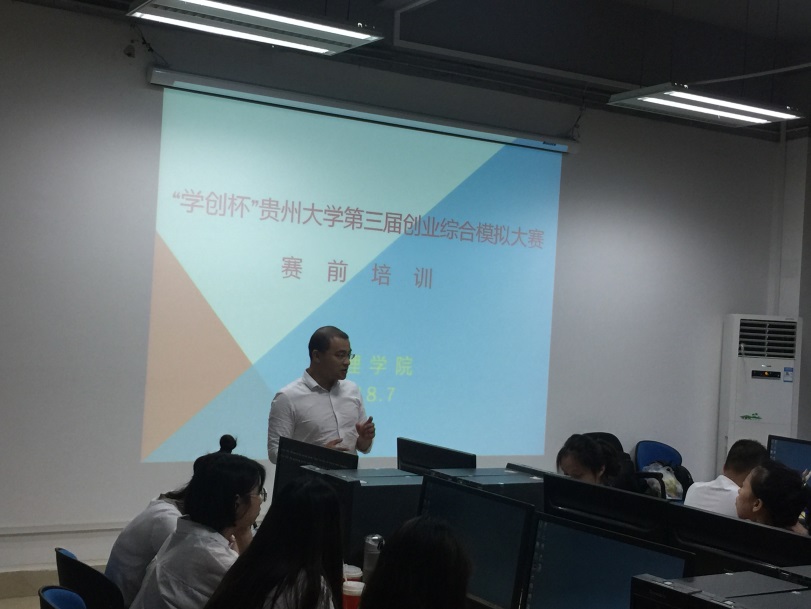 截止2018年7月10日,共有来自经济学院、管理学院、农学院、材料与冶金学院等29个学院的40支队伍报名参赛,比赛采用《创业之星》软件作为竞赛平台,以3人为一个团队,在虚拟的企业经营环境中,对企业进行4个季度的经营管理。参赛选手必须根据每个季度的市场环境对产品的设计、研发、市场、广告等进行分析与运作。最终以各参赛队伍的盈利表现、市场表现、投资表现、和成长表现等构成的综合评分评出优胜者。本次比赛得到了舟道信息科技(上海)有限公司和诺亚教育科技(贵安新区)有限公司在技术上的大力支持,对参赛队伍进行了为期4天的赛前培训,通过培训让参赛选手们对比赛平台和规则有了清楚地认识。