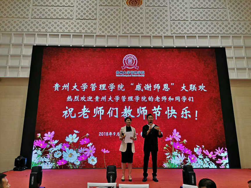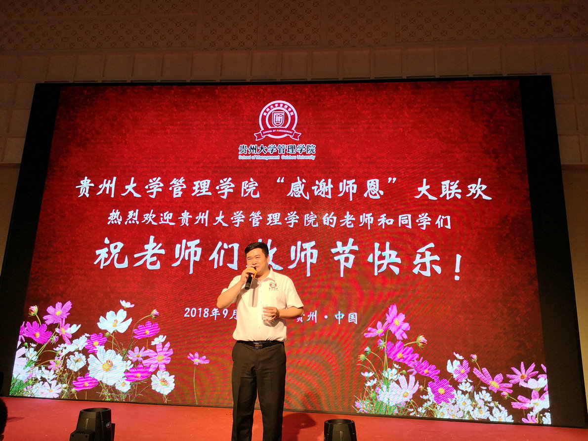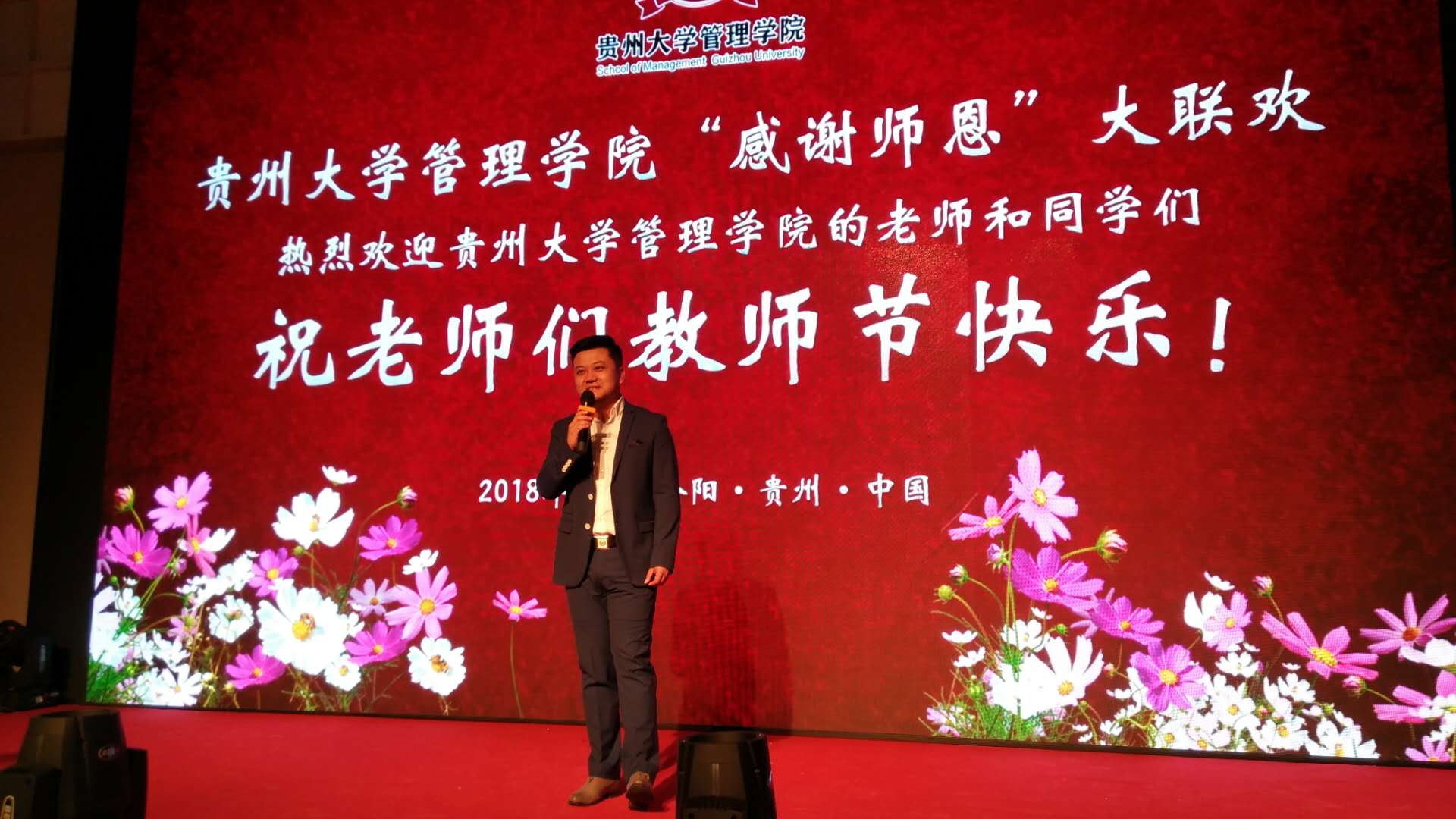 9月10日下午,乐鱼(中国)校友会大型活动“感谢师恩”大联欢在金阳国窖1573举办,本次活动由乐鱼(中国)主办,贵州大学校友总会管理学院分会承办,同时贵州国际酒类博览会股份有限公司与牟池酒业赞助支持。时值教师节,贵州大学管理学院院长李烨、副院长王婷、周莉莉、宋山梅,院党委副书记张亚军等200余名师生欢聚一堂,在歌声舞语之中,共同庆祝教师节。