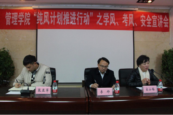 一学期的紧张学习已接近尾声,英语四、六级考试及期末考试也即将到来,为了加强管理学院学风、考风建设及增强学生安全意识,12月13日中午13:00,管理学院在学院三楼报告厅举行了管理学院“纯风计划推进行动”之学风、考风、安全宣讲会。莅临本次宣讲会的学院领导有管理学院院长李烨教授、管理学院副院长宋山梅教授,管理学院党委副书记张亚军老师。学院教学科和学生科全体老师、各班级主要学生干部及学生代表以及学院团委学生会主要干部代表等参加本次宣讲会。本次会议由学生科科长芮丽华老师主持。