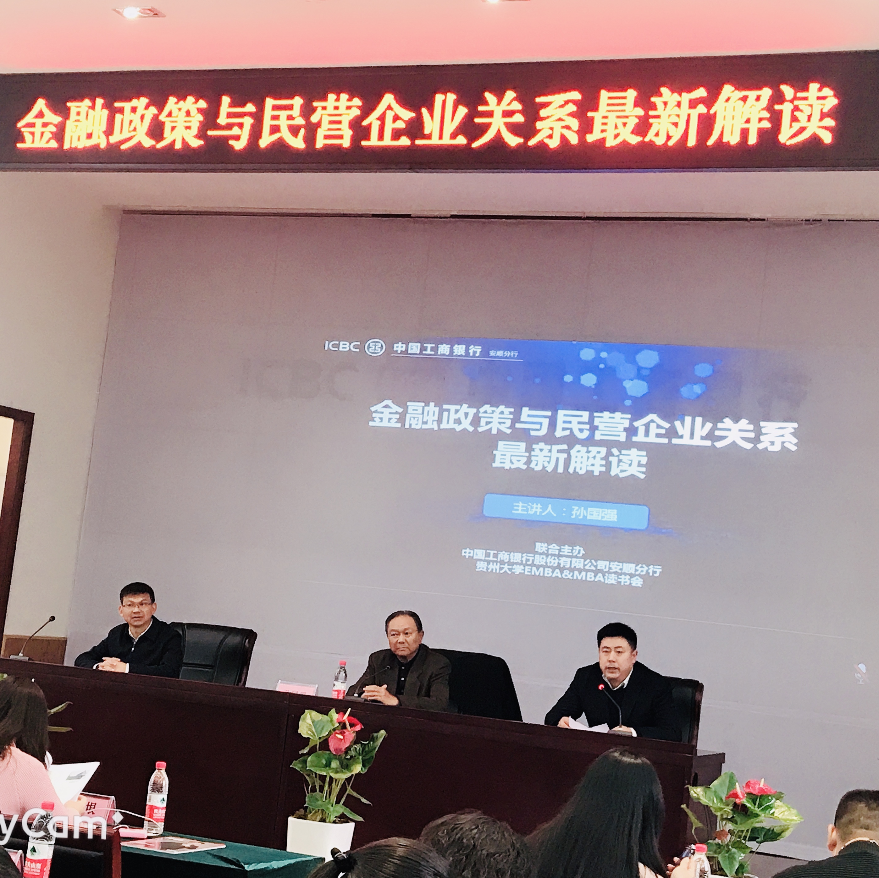 2019年2月23日下午,中国工商银行安顺分行和贵州大学菁英(EMBA&MBA)读书会特地邀请孙国强导师(原贵州省副省长)在工行安顺分行,作了主题为“金融政策与民营企业关系最新解读”的演讲。孙国强导师主要从商品、货币与资本、资本与资金、虚拟经济与实体经济、金融和银行的、投资和融资、银行的借贷和企业的发展、金融政策与民营企业发展以及新投融资体系及未来八个方面对主题进行了精彩的讲解。安顺市委市政府的领导、安顺市辖区银行、金融机构主要负责人、中国工商银行安顺分行读书会(中高层干部)、安顺本地知名民营企业家、贵州大学EMBA&MBA读书会会员等近120名人员盛况出席本次活动。