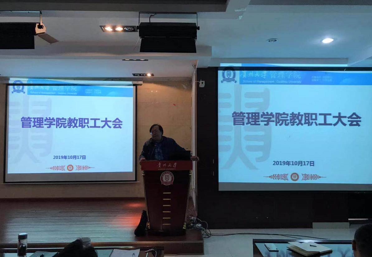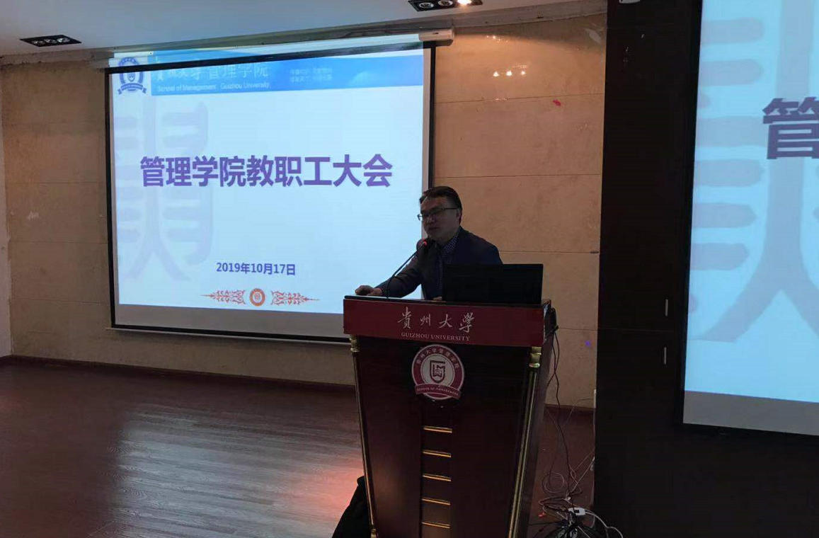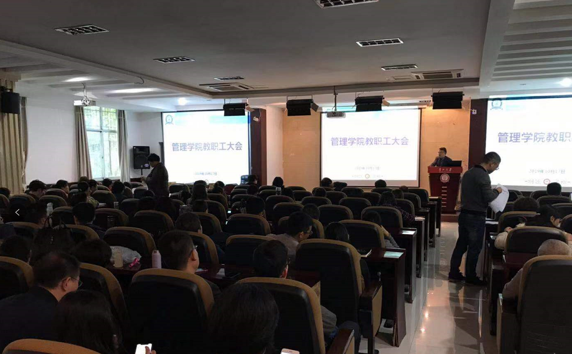 2019年10月17日中午12:30,学院在致远楼三楼报告厅召开全院教职工大会。学院党政领导班子、全体教职工及学生党员代表参加会议。会议由学院党委副书记、院长李烨教授主持。