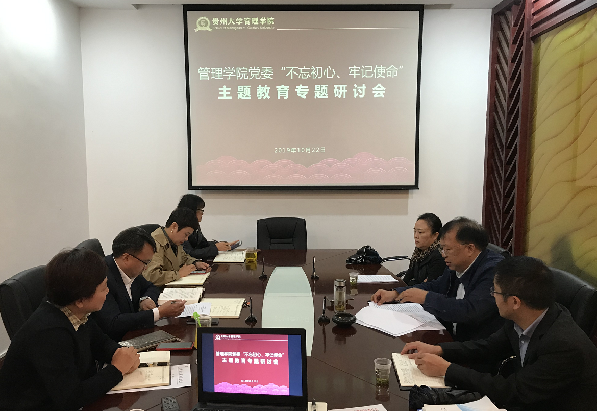 2019年10月23日下午17:00,管理学院党委在致远楼三楼小会议室召开主题教育专题研讨第三次会议。学院党委领导班子成员参加会议,会议由学院院长李烨主持。