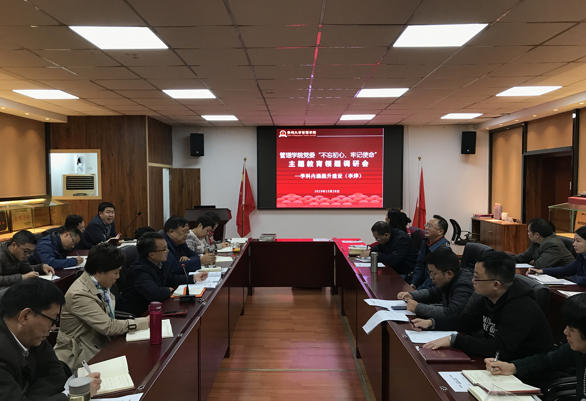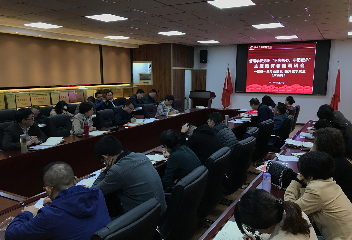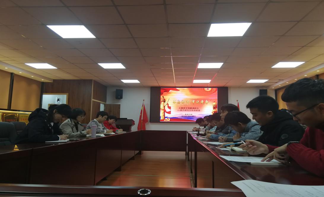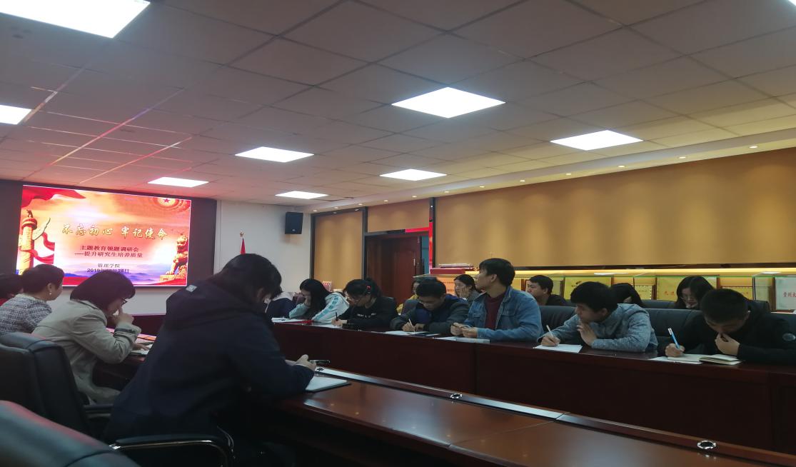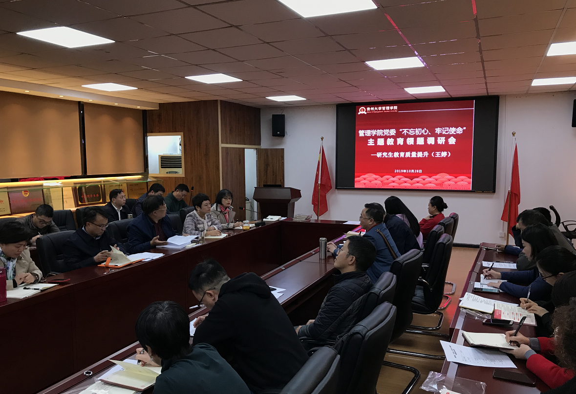 2019年10月28日,管理学院在致远楼三楼陈列室召开“不忘初心,牢记使命”主题教育领题研讨会之提升研究生培养质量,出席此次会议的领导有管理学院副院长王婷教授、管理学院副院长周莉莉教授、管理学院研究生科科长徐兰老师、管理学院工程硕士中心主任徐丹老师,除此之外还有管理学院2017、2018、2019级学术型硕士研究生学生代表。