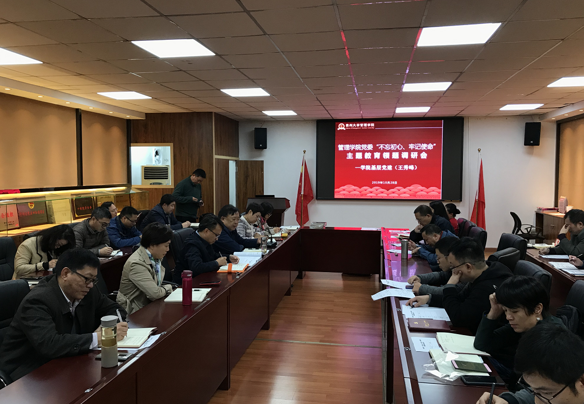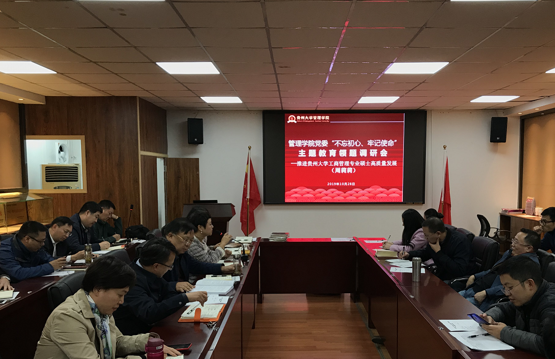 学院领导班子按照学校《中共贵州大学委员会“不忘初心、牢记使命”主题教育实施方案》要求,认真开展领题调研,根据前期面对全体教职工的调研情况,围绕分管工作的重点拟定调研题目。王秀峰书记的题目是学院基层党建、李烨院长的题目是学科内涵提升建筑、王婷副院长的题目是研究生教育质量提升、周莉莉副院长的题目是推进贵州大学工商管理专业硕士高质量发展、宋山梅副院长的题目是推进一流专业建设,提升教学质量。