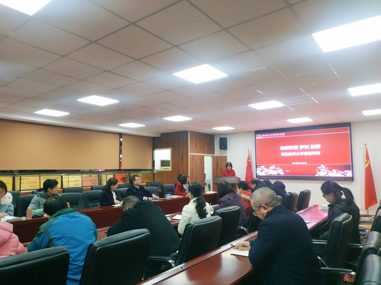 11月28日上午,四川大学商学院罗利教授应邀来我校,参加第103期贵州大学文科讲坛——国家基金项目管理类方向申请,在管理学院进行学术交流,做了关于国家基金项目申请的专题讲座。讲座由管理学院院长王婷主持,管院部分教师及2018级博士研究生及部分硕士研究生到场聆听。