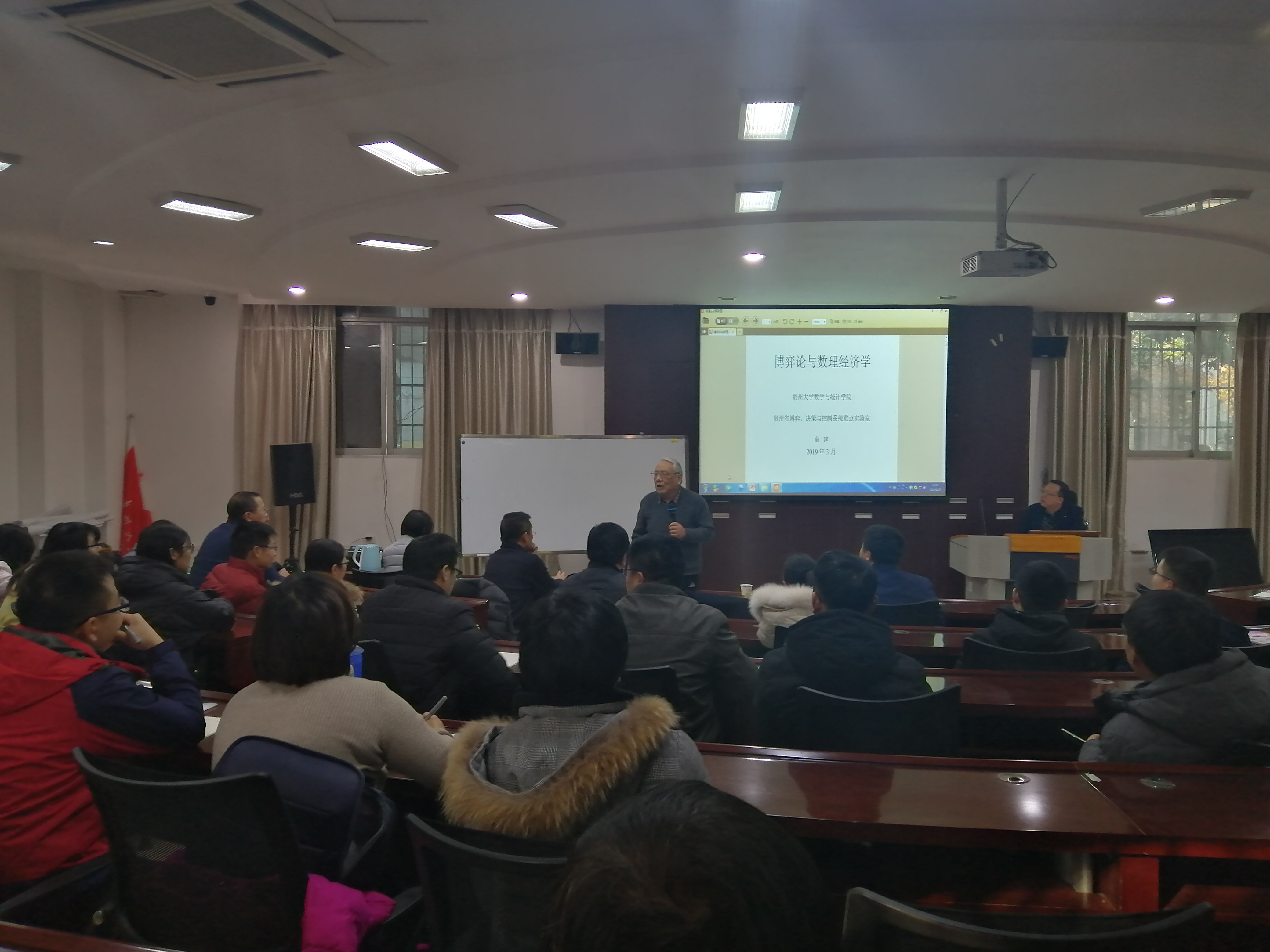 12月9日下午15:00,贵州大学数学与统计学院俞建教授莅临乐鱼(中国),在管理学院一楼圆形教室报告厅做了题为“博弈论与数理经济学”的专题讲座。讲座由管理学院副院长王婷主持,管院部分教师及2018级全体研究生到场聆听。
