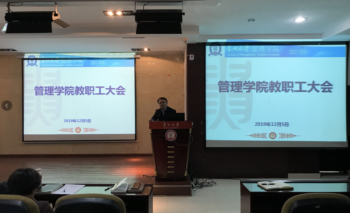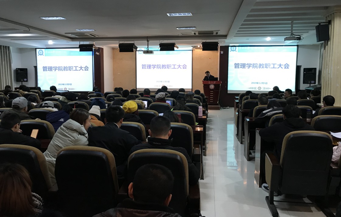 2019年12月5日中午12:30,管理学院在致远楼三楼报告厅召开全院教职工大会。学院党政领导班子、全体教职工参加会议。会议由学院院长李烨教授主持。