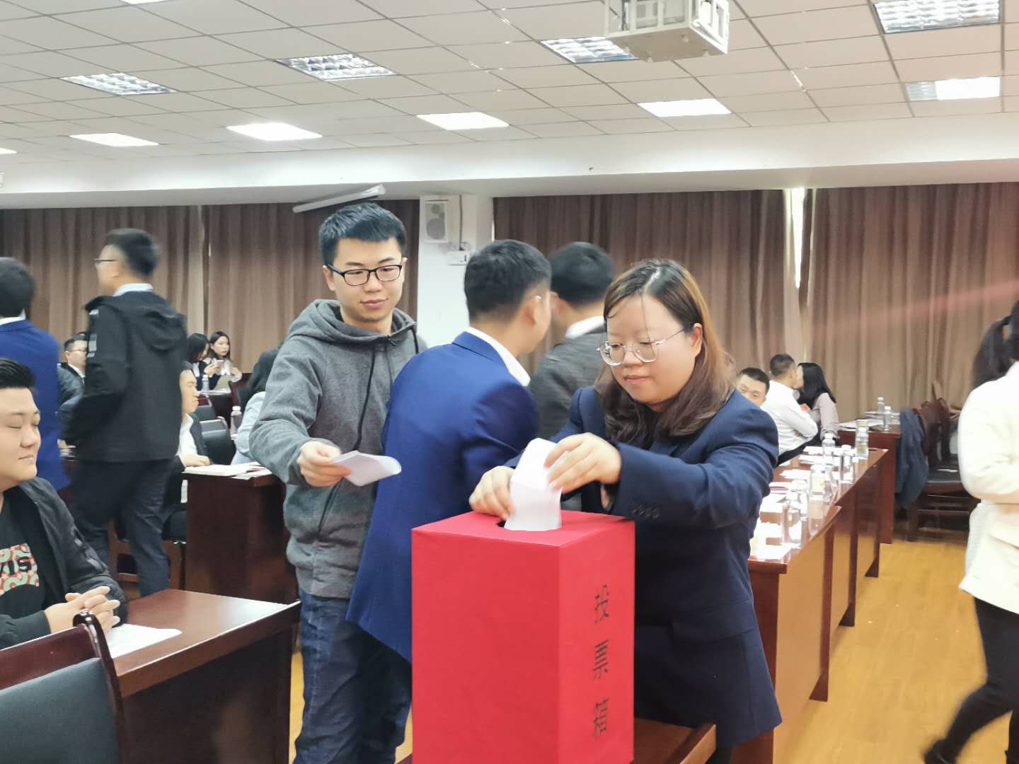 演讲完毕,学生代表进行投票,中心老师监票、计票和唱票,最后选出票数过半并且得票最多的五位主席团成员,经过学院领导、中心主任和主席团成员的商议之后,最终确定常翀为第九届联合会主席,石俊、何贤东、张文静、胡兴燕为副主席,并现场颁发了任命书。