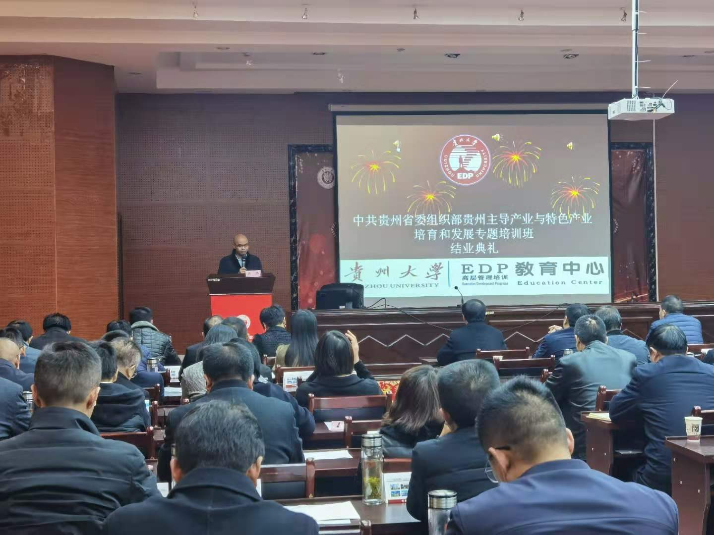 贵州大学吴攀副校长致辞。他表示,通过本次《贵州主导产业与特色产业培育和发展专题培训班》,各级干部对习近平总书记关于农业农村工作的重要论述、学习理解更加深刻,带领群众增收的本领进一步增强,善统筹、尽全责、敢担当、有作为的工作氛围更加浓厚,五天的培训,不仅对各位领导今后的工作提出要求,也鼓励各位干部学员努力把自己锻炼成为一名肯干、敢干、善干的干部,努力成为政治上靠得住、工作上有本事、作风上过得硬的学习型、知识型、实干型相统一的优秀干部。