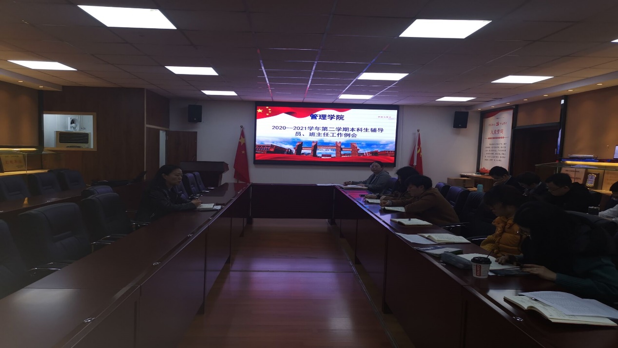 2021年4月15日中午14:00,管理学院于致远楼三楼陈列室召开管理学院2020-2021学年第二学期本科生辅导员、班主任工作例会。管理学院全体辅导员、班主任出席了本次会议。会议由院党委副书记洪影秋老师主持。