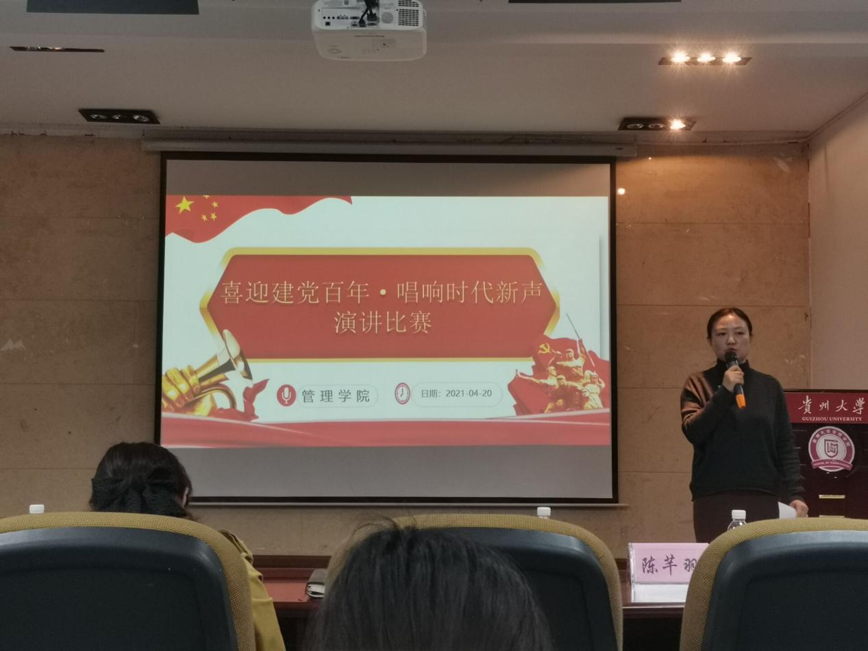 为了庆祝党的百年华诞,深入党史教育,发扬爱国精神。2021年4月20日,管理学院在三楼报告厅举办“喜迎建党百年,唱响时代新声”主题演讲比赛。出席本次演讲比赛的评委是:管理学院党委副书记洪影秋老师、学生科科长芮丽华老师、学生科辅导员陈芊羽老师、向珂莹老师、车婧娴老师以及陈黔江老师。参加本次比赛的选手来自管理学院本科2018、2019级各个班级,总计十九位同学。本次演讲比赛由王正宏同学主持。