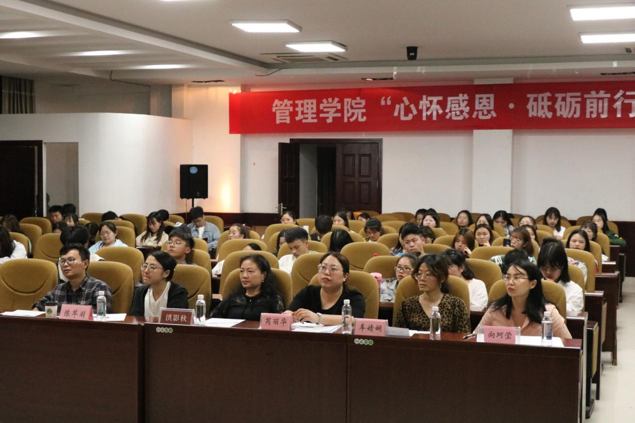 为进一步推进学院资助育人工作,引导广大受助学生不畏困难,励志成长,感恩奉献。管理学院于6月1日在三楼报告厅举办“心怀感恩,砥砺前行”感恩资助宣讲比赛。本次比赛的评委分别是:管理学院党委副书记洪影秋,学生科科长芮丽华,学生科辅导员陈芊羽、向珂莹、车婧娴、陈黔江。来自学院的十一支参赛队伍参加本次宣讲。