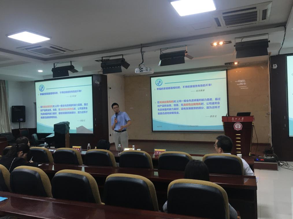 邓建平教授作了题为”主题资金管理模式创新”的主题讲座,与广大师生共同讨论公司资金管理中存在的资金流风险,邓教授以沃尔玛、德尔、四川长虹、新疆屯河、贵州茅台等多家公司作为案例探讨营运资本与资金需求之间的匹配性风险、资产管理、去杠杆、债转股、关注资产负债表隐藏风险等问题,深入浅出、幽默生动,极大地调动了学生们的学习兴趣,同时也对让大家对财务分析有了更深刻地认识。