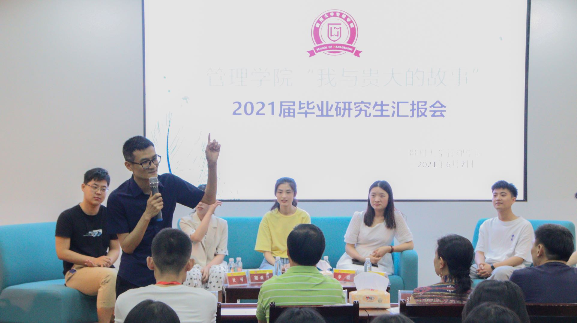 罗敏副院长作总结发言。他表示,2018级的毕业研究生们在思想上紧跟社会主义新时代步伐,做到了思想跟得上、靠得住、信得过、行得通,在科研学术、文化传承和社会服务等方面为学弟学妹们树立了榜样,为助推学校部省合建和“双一流建设”做出了新时代研究生的贡献。至此,管理学院“我与贵大的故事”2021届毕业研究生汇报会圆满落幕。