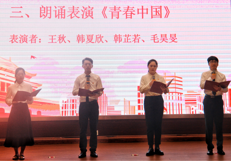 学生代表带来朗诵《青春中国》展现了中国共产党的强大精神力量,以诗传情,以诗载史,以诗颂党。歌曲《不忘初心》让在座师生感受到建党百年的筚路蓝缕,汇聚磅礴力量增强了在场党员的荣誉感、归属感、使命感。