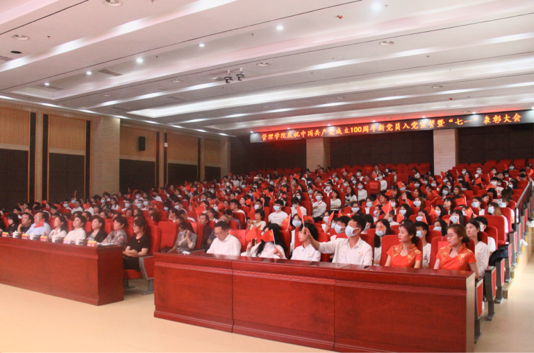 贵大新闻网讯6月30日中午,管理学院庆祝中国共产党成立100周年新党员入党宣誓暨“七·一”表彰大会在西校区贤正楼报告厅举行。管理学院党委书记王秀峰出席会议,学院副书记洪影秋、副院长罗敏、王婷、周莉莉、宋山梅,各科室负责人、教工党员、学生党员代表及入党积极分子参加大会。