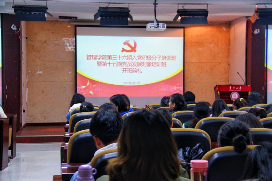 4月15日中午13点,管理学院第36期入党积极分子培训班和第15期党员发展对象培训班开班典礼在致远楼三楼报告厅举行。管理学院党委书记、管理学院分党校校长王秀峰,管理学院党委副书记、院长李烨,贵州大学正处级组织员周莉莉,管理学院党委副书记洪影秋出席本次开班典礼,本次入党积极分子培训班和发展对象培训班全体学员参加,开班典礼由班主任向珂莹主持。