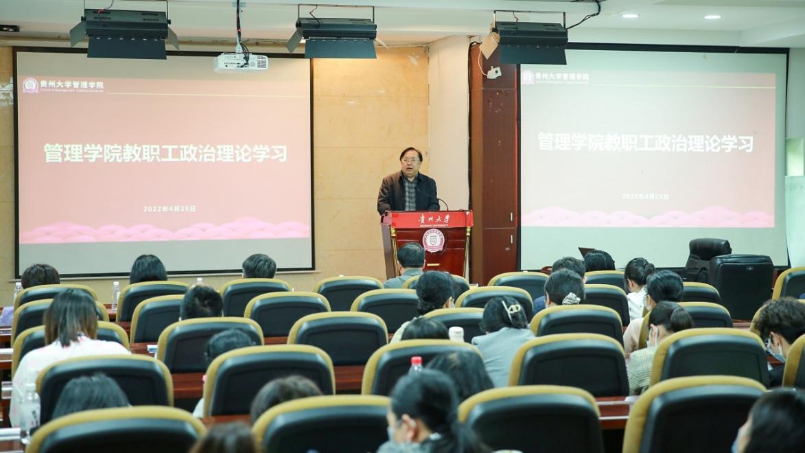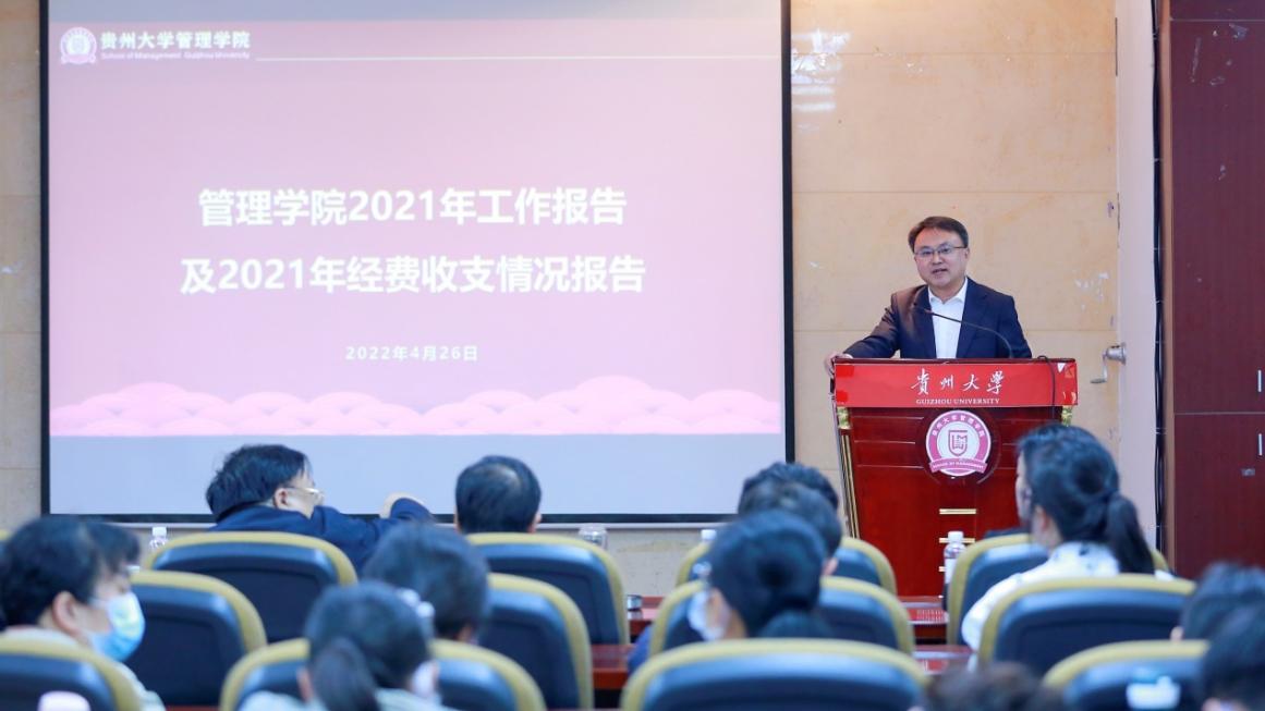 院长李烨向大会作管理学院2021年度工作报告及2021年度经费收支情况报告,他从党建思政、人才培养、师资队伍、科学研究、交流合作、社会服务等方面做了总结,同时对全体教职工一年来的辛勤付出表示感谢。他指出,过去一年,学院各项工作有收获,也有不足,学院要紧紧围绕做强贵州大学的发展方向,对标对表查找短板弱项,牢牢把握好国发〔2022〕2号文件的重大机遇,贯彻落实好贵州省第十三次党代会精神,进一步加强师资队伍建设,尤其是高层次人才的引进和培养,强力推进“博学计划”,在“关键指标”上下功夫,补短板强弱项,加快推动学院高质量发展步伐。随后,对管理学院2021年经费收支情况作简要报告,并强调,学院各部门要精打细算,开源节流,加强节约型部门建设,确保学院平稳健康发展。