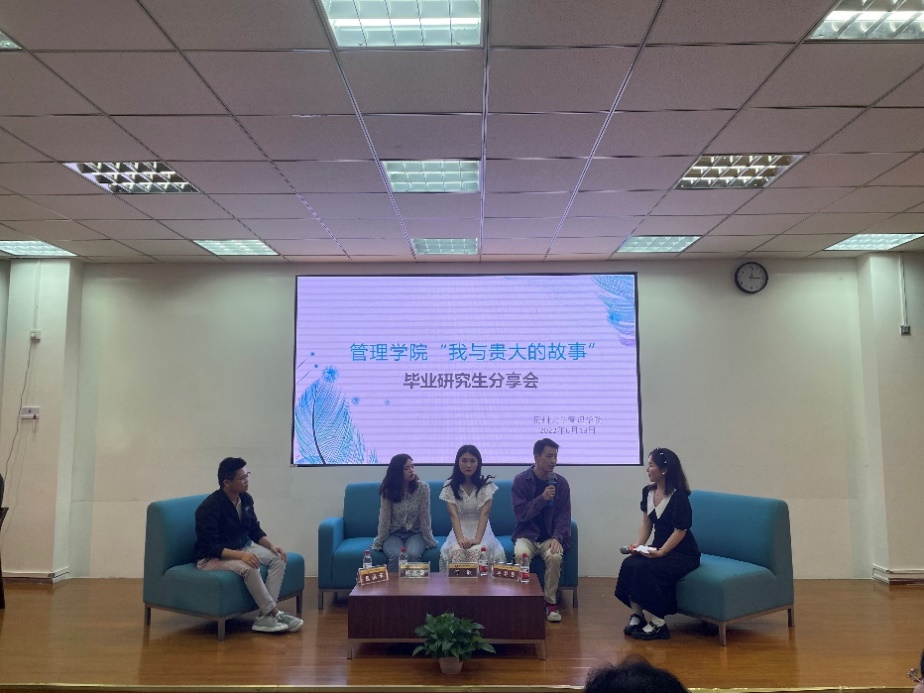 为发扬优秀毕业研究生榜样的精神,引导更多的同学向先进看齐,营造争先奋进的良好校园氛围。6月13日下午,“我与贵大的故事”——管理学院2022届硕士研究生毕业分享会在东校区慎思楼MBA报告厅举行。管理学院党委副书记洪影秋、管理学院研究生科科长徐兰、管理学院团委负责人研究生会秘书长车婧娴、管理学院研究生科辅导员龚潇潇、研究生科老师罗敬及全院研究生参加分享会。2019级管理科学与工程专业研究生魏俐华、田美慧,2019级企业管理专业研究生何欣、毛昊旻受邀作为优秀毕业研究生代表,向全院师生作分享汇报。