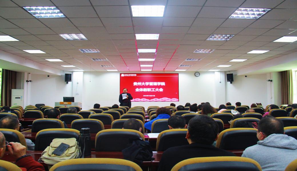 2022年10月31日中午,管理学院在慎思楼二楼报告厅召开全院教职工政治理论学习暨教职工大会。管理学院领导班子出席会议,全体教职工及学生代表参加会议。会议由学院党委书记王秀峰主持。