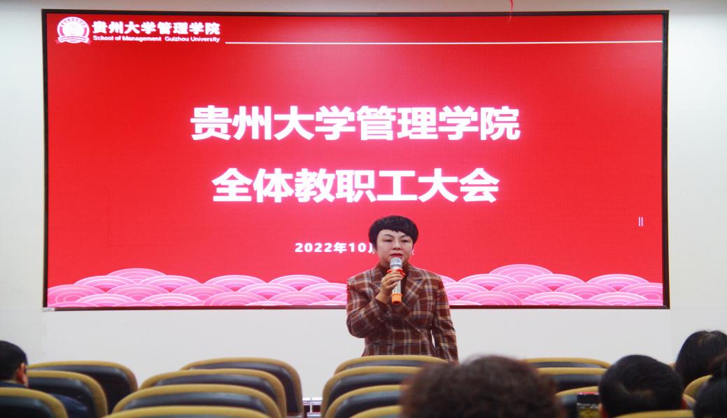 贵州大学正处级组织员周莉莉给MBA、EMBA教学任务等方面布置了任务,同时也强调“博学计划”的有效落实,要求各专业老师在课堂内外积极指导学生,踏实提高学生升学质量。在党建工作方面,她指出,各支部书记要按照组织部要求完成贵州大学2022年度基层党建工作成效考核工作。而在赛事方面,她尤其指出第18届“挑战杯”将在贵州大学承办,并鼓励各位同学积极参与,要求各位老师要积极指导学生,为管院的发展助力。